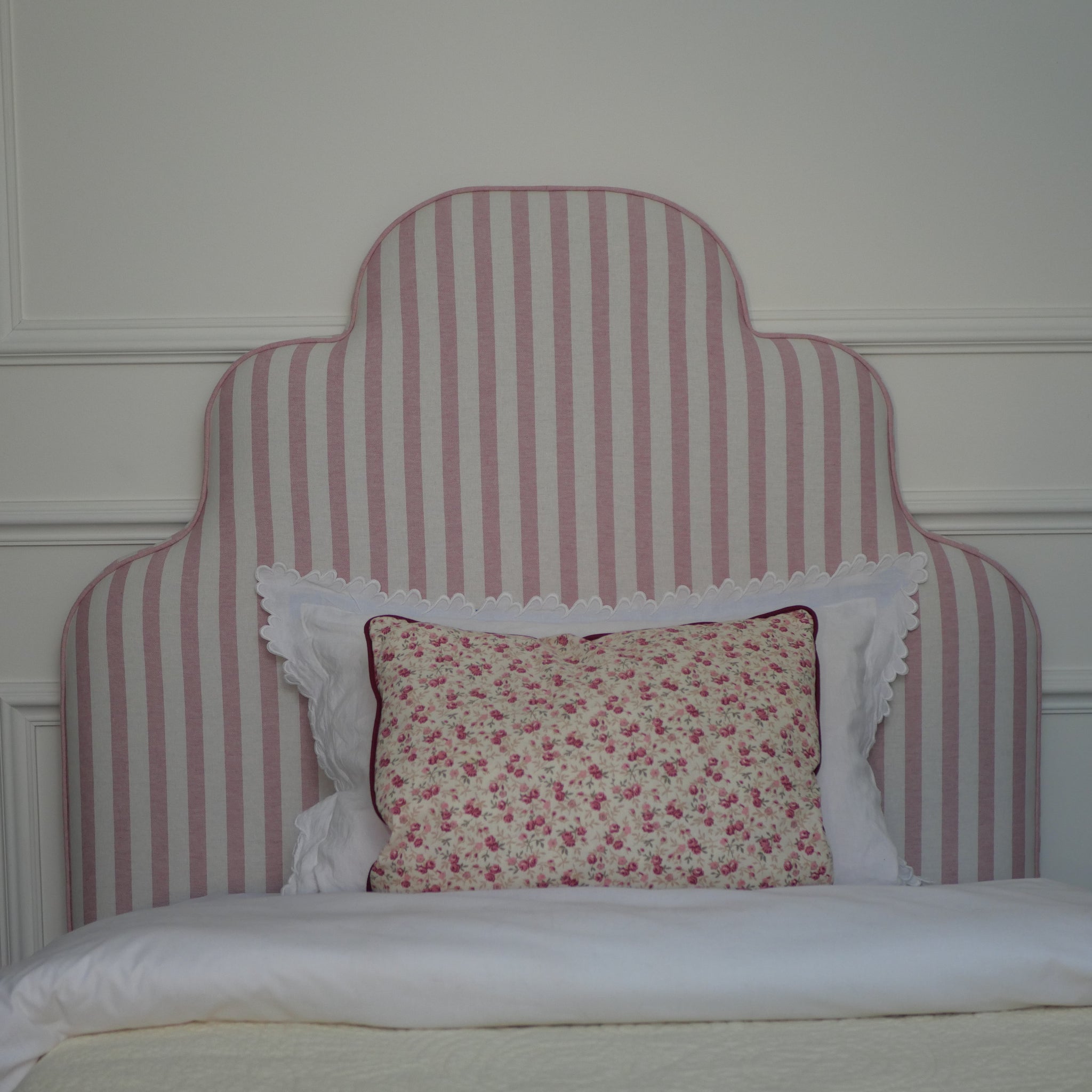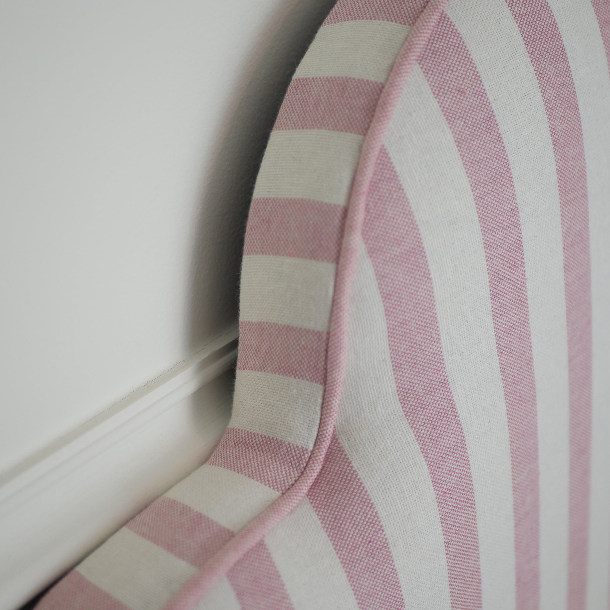 La tête de lit Pèlerine en coton rayé rose apporte une touche de douceur à la chambre de votre enfant. Les jolies courbes de son design invitent à la rêverie.